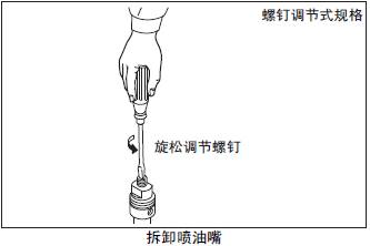 (3) 三菱S6R發(fā)動機調(diào)整噴油壓力時,先拆除噴油器的定位螺釘,旋松蓋螺帽,用螺絲刀旋轉調(diào)節(jié)螺釘。