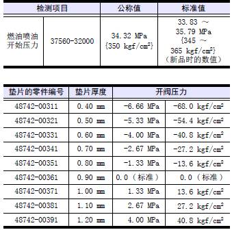 (3) 噴油開始壓力通過增減墊片調(diào)整。墊片分0.40 ~1.20 mm 的9 種。參照下表進行調(diào)整。