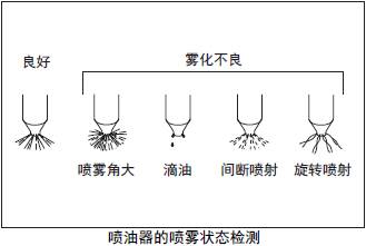在噴油器試驗臺上調(diào)整壓力的同時,檢查噴孔堵塞、噴霧狀態(tài)以及噴孔內(nèi)有無漏油現(xiàn)象等。噴霧不良時,清洗或更換噴油嘴。霧化檢測項目如下。筆直噴射。無大顆粒,微細噴霧。噴射后,噴孔無殘余油滴。