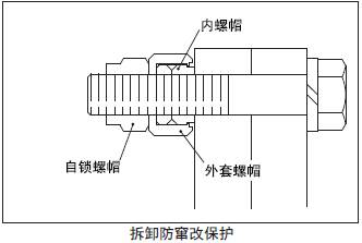防竄改保護螺帽有2重構(gòu)造,不能夠簡單的旋轉(zhuǎn)拆除。拆除時,必須切斷破壞筒形外螺帽,然后才能拆卸內(nèi)螺帽。