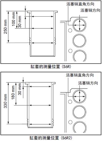 選擇三菱S6R柴油發(fā)動機缸套內(nèi)側(cè)的上部( 上死點時No.1 氣環(huán)的位置)、中間部分和O形圈插入部分,沿三菱S6R柴油發(fā)動機活塞銷方向及其直角方向,測量三菱S6R柴油發(fā)動機缸套的內(nèi)徑。