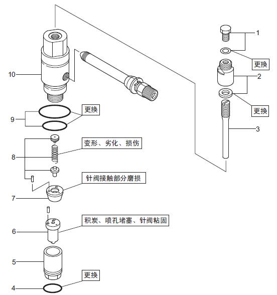 目測(cè)檢查座圈,發(fā)現(xiàn)針閥接觸面或高壓密封面顯著磨損時(shí)更換新的座圈。