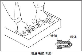 (5) 調(diào)整和清洗后噴霧狀態(tài)不能好轉(zhuǎn)的話(huà),要更換新的噴油嘴。新的噴油嘴涂有防銹劑,最初一定要用清洗油清洗,然后用柴油再次清洗后才能組裝。