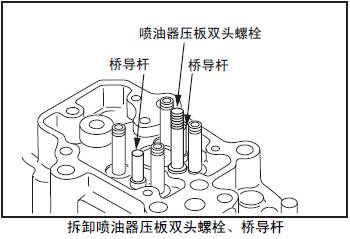 拆卸時參照「三菱R16柴油發(fā)動機本體的檢測、修理」的「三菱R16柴油發(fā)動機噴油器壓板雙頭螺栓、橋?qū)U的檢測,更換」項。