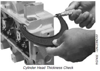 Measure head thickness from valve cover gasketrail-to-combustion face.If cylinder head thickness is less than minimum allowable