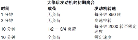 重要提示: 在磨合初期,定時(shí)檢查機(jī)油壓力和冷卻液溫度。還應(yīng)該檢查燃油、機(jī)油或冷卻液是否有泄漏跡象。一次全負(fù)荷運(yùn)轉(zhuǎn)時(shí)間不能超過 10 分鐘。