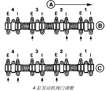 4. 調(diào)節(jié) 2 號(hào)和 4 號(hào)汽缸排氣閥門(mén)間隙和 3 號(hào)和 4 號(hào)汽缸進(jìn)氣閥門(mén)間隙。