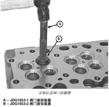 1. 用 JDG1653-1 閥門座孔拆裝器(A) 和 JDG1653-2 閥門座孔鑲?cè)Π惭b器(B) 安裝缸蓋閥門座孔鑲?cè)?。?JDG1653-2 閥門座安裝器的一端安裝進(jìn)氣閥門座鑲?cè)Γ昧硪欢税惭b排氣閥門座鑲?cè)Α?/P>