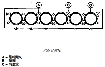 5. 使用短帶帽螺釘(A) 和 3 毫米(1/8 英寸)厚的墊圈(B) 固定汽缸套(C)。在兩個(gè)位置上擰緊每個(gè)襯套的固定螺釘。擰緊帶帽螺釘?shù)?68 牛頓米(50 磅英尺)。