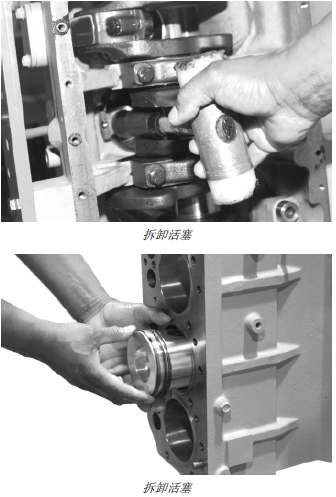 重要提示: 握住活塞,以防活塞掉落?;钊h(huán)脫離汽缸套后,活塞便會(huì)掉落。如果重復(fù)使用汽缸套,拆卸活塞和連桿總成時(shí)一定要格外小心,不要讓連桿撞擊汽缸套孔。