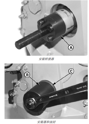 重要提示: 為保證安裝正確,曲軸和耐磨套外徑必須要用 Brake Kleen、IgnitionCleaner 或等效產(chǎn)品進行清洗,風(fēng)干后再安裝油封 (C)。