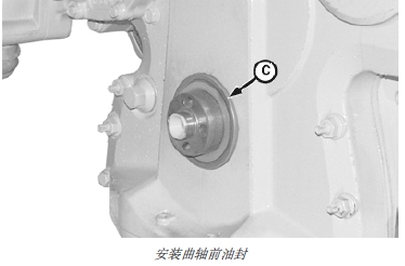 3. 在油封邊上涂上一層干凈的機油,將油封 (C) 裝在曲軸的凸緣上。(油封裝彈簧的一頭應(yīng)先裝進正時齒輪蓋內(nèi)。)