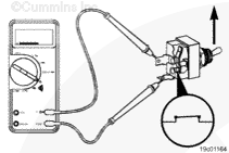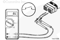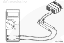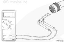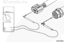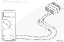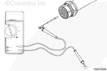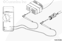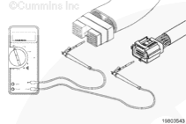 從康明斯電子控制模塊 (ECM) 上斷開原始設(shè)備制造商 (OEM) 線束接頭。將一根測(cè)試導(dǎo)線插入 OEM 線束接頭上的開關(guān)回路觸針,然后將鱷魚夾連接到萬用表表筆上。將另一根導(dǎo)線插入 OEM 線束接頭上的風(fēng)扇控制開關(guān)信號(hào)觸針,然后將鱷魚夾連接到萬用表另一個(gè)表筆上。