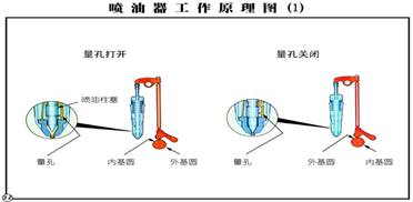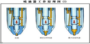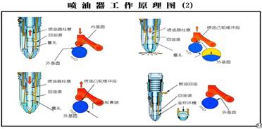 旁通階段:噴油器處于停止供油狀態(tài),柱塞被壓在最低位置,柱塞中部細的部位把噴油器內(nèi)部的進回油道勾通。這時燃油對噴油器進行冷卻,并排除油道中的氣體,發(fā)動機在作功和排氣沖程中噴油器柱塞一直處于這一狀態(tài)。 計量(量油)階段:當(dāng)凸輪繼續(xù)旋轉(zhuǎn)到進氣沖程后不久,由于凸輪外型曲線的變化,柱塞在彈簧的作用下升起,先將進、回油道切斷,燃油旁通結(jié)束,量孔開始計量,燃油流至噴油器的油杯,此時由于油壓低,噴孔直徑?。ā?.17mm)而不會漏油。當(dāng)柱塞上升到最高位置后,凸輪外型曲線保持平穩(wěn),柱塞處在最高位置直到進氣結(jié)束。在壓縮沖程中,在凸輪曲線的作用下,柱塞緩慢下行,直至接近封閉計量孔,計量結(jié)束。 準備噴射階段:計量結(jié)束后,柱塞下行到一定的位置,下部的油杯及油道就產(chǎn)生了一定的壓力,使止回球閥落到球座上,關(guān)閉了進油道,柱塞繼續(xù)下行把油道與油杯分開,由于發(fā)動機轉(zhuǎn)速高、計量時間短,其油杯不會被燃油充滿,所以,這階段只是壓縮和部分地排除油杯中的氣體,為噴射作準備。 噴射階段:在發(fā)動機壓縮沖程接近終了時,凸輪外型曲線又有突然的變化,使柱塞快速下行,把油杯里的燃油以1056KG/CM²的高壓,噴入汽缸內(nèi),在噴射的同時,柱塞中部細的部位又使進、回油道聯(lián)通,燃油又開始旁通,柱塞最后落到油杯上,噴油結(jié)束。