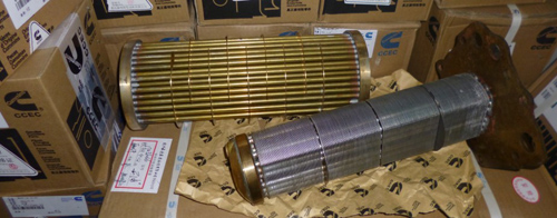 康明斯KTA發(fā)動(dòng)機(jī)采用內(nèi)置式板翼式,置于發(fā)動(dòng)機(jī)水道腔體內(nèi),直列與V形機(jī)型的區(qū)別在于:直列機(jī)型機(jī)油冷卻器芯置于機(jī)體側(cè)部水道腔體內(nèi), V形機(jī)型機(jī)油冷卻器芯置于V型機(jī)體中部水道腔體內(nèi)。)M11發(fā)動(dòng)機(jī)采用整體管束式冷卻器,置于發(fā)動(dòng)機(jī)排氣管側(cè)。