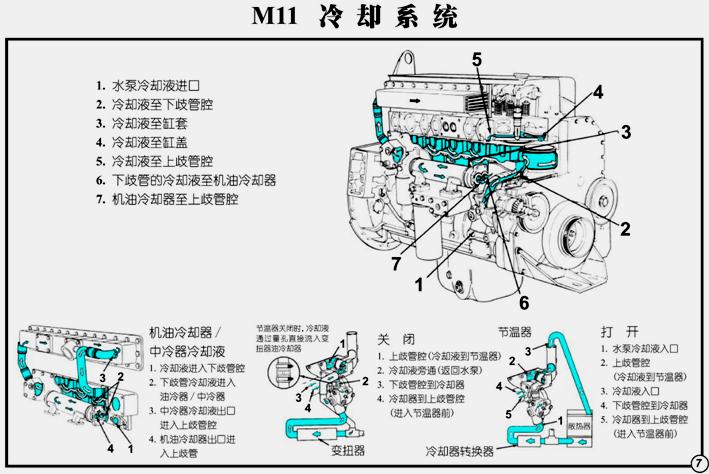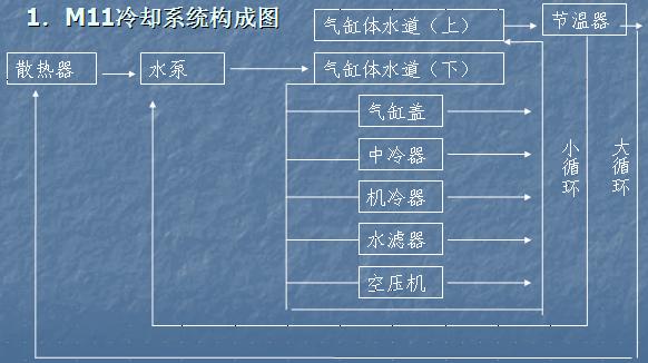 由散熱器、水泵、氣缸體水道、氣缸蓋水道、出水管、節(jié)溫器、水濾器、中冷器、機(jī)油冷卻器、以及選用件空氣壓縮機(jī)、液壓油冷卻器。