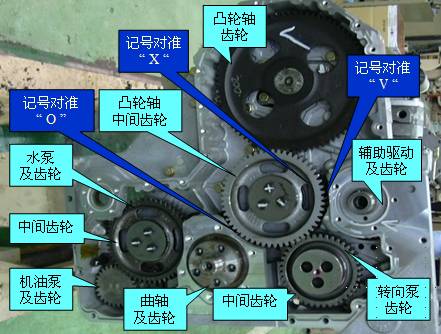 1.正時(shí)齒輪系:由曲軸齒輪、凸輪軸齒輪、輔助驅(qū)動(dòng)齒輪以及中間齒輪等構(gòu)成;由曲軸齒輪將運(yùn)動(dòng)傳遞給凸輪軸齒輪、輔助驅(qū)動(dòng)齒輪,并由正時(shí)記號建立相互間的轉(zhuǎn)角關(guān)系,其中心距和齒側(cè)間隙由設(shè)計(jì)保證,裝配時(shí)勿需調(diào)整。