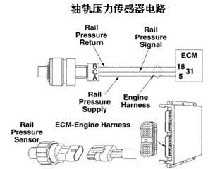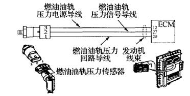 安裝在高壓燃油共軌內(nèi),其功能是:ECM利用該傳感器信號(hào)確定油軌中的燃油壓力,同時(shí)利用它來(lái)計(jì)算燃油供油量,工作范圍在0~1500 Ba,。傳感器出現(xiàn)故障將導(dǎo)致發(fā)動(dòng)機(jī)動(dòng)力下降、轉(zhuǎn)速降低甚至停車。