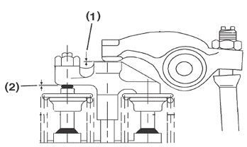 對(duì)于四氣門汽缸頭,兩氣門是由在兩氣門之間的單一搖臂通過氣門橋帶動(dòng)的。在調(diào)整搖臂和氣門橋之間的間隙1前該間隙2應(yīng)首先設(shè)置。