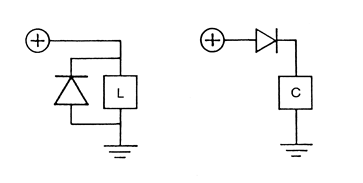 左圖為L-電路和C-電路續(xù)流二極管的接法, 對于存在L-電路和C-電路的地方必須接續(xù)流二極管,以防止脈沖電壓的產生,從而引起電路其它元件的損傷.