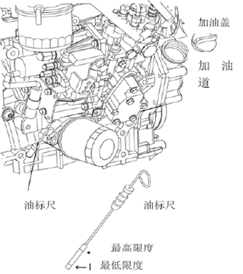 調整機器位置水平后,將油量計完全插入,測量油量高度.如果發(fā)動機開機后已加油,應在發(fā)動機停機后10分鐘以后檢查,確保機油回到機油盤中.
