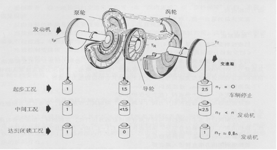 變矩器由泵輪、渦輪和導(dǎo)輪三種旋轉(zhuǎn)元件所組成,由這三個(gè)工作輪組成一個(gè)循環(huán)圓系統(tǒng)。液體按上述順序通過循環(huán)圓流動(dòng),發(fā)動(dòng)機(jī)的機(jī)械能,通過泵輪轉(zhuǎn)換為液體的動(dòng)能,再由渦輪轉(zhuǎn)換為機(jī)械能,變速器內(nèi)的供油泵不斷地把壓力油供給變矩器,這樣才能使變矩器工作起作用,即增加發(fā)動(dòng)機(jī)的輸出扭矩,同時(shí)通過經(jīng)變矩器排出的油帶走變矩器內(nèi)產(chǎn)生的熱量并將熱量排出。