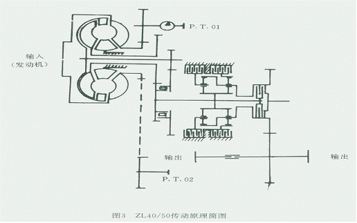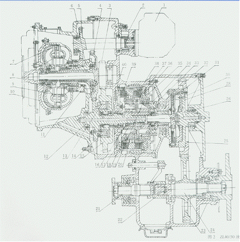 雙渦輪變矩器、行星變速箱,動(dòng)力換檔,機(jī)液控制為ZL40/50裝載機(jī)配套