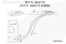 條件 停機/運轉開關處在“STOP”(停機)位置。 控制器不在診斷模式。 采取措施 將機油壓力傳感器抽頭電纜(零件號 3824775)安裝到傳感器與傳感器線束接頭之間。 將抽頭電纜電源(觸針 A)和回路(觸針 B)接頭安裝在萬用表上,測量電源電壓。 |