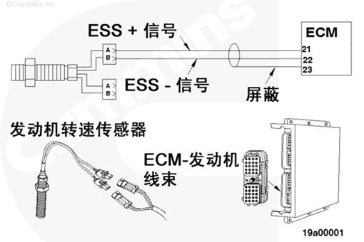 發(fā)動(dòng)機(jī)線束電子控制模塊 (ECM) 接頭的發(fā)動(dòng)機(jī)轉(zhuǎn)速傳感器 (ESS) 信號(hào)觸針 21 和 22 表明發(fā)動(dòng)機(jī)轉(zhuǎn)速超過報(bào)警(停機(jī))閾值。 |