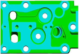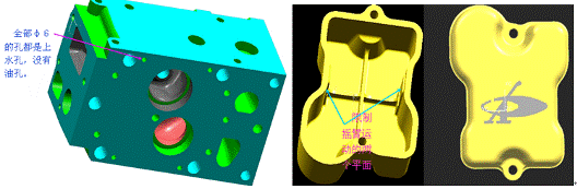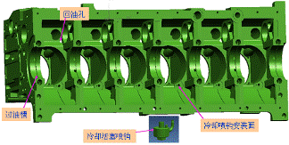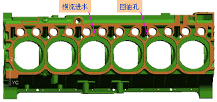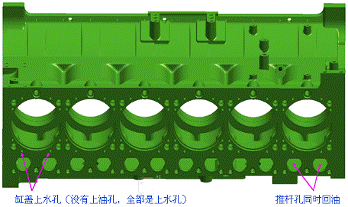 玉柴氣缸體-底面視圖:主油道通副油道的過渡由主軸承孔開槽來實現(xiàn),不必另外布置油道,結(jié)構(gòu)簡單。