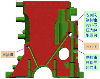 主、副油道鉆兩個斜孔,并通過主軸承孔連通,實現(xiàn)副油道供冷卻噴鉤的機油和潤滑油泵的機油。