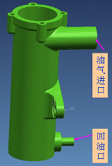 油氣有一定速度沿切線進入油氣分離器并做旋轉(zhuǎn)運動,在離心力的作用下,油滴被甩到分離器的壁上,由下面的回油孔回到油底殼油面以下