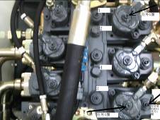 按下控制屏上“F3”鍵,把馬達轉(zhuǎn)速測量工裝吸到行走馬達上,把測線接到測試儀上,斜推 操縱桿,使左,右馬達分別正轉(zhuǎn),測轉(zhuǎn)速應為12轉(zhuǎn)。使左右馬達分別反轉(zhuǎn),測轉(zhuǎn)速應為12轉(zhuǎn)。若轉(zhuǎn)速達不到要求,則調(diào)節(jié)左右馬達控制閥塊螺釘,如下圖。
