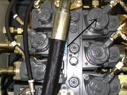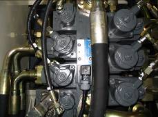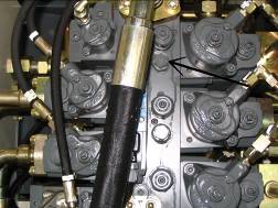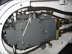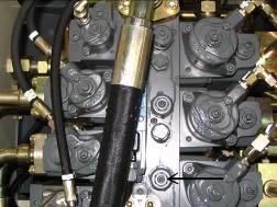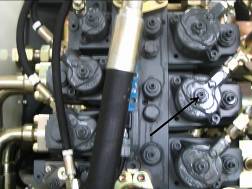 按下控制屏上“F3”鍵,快速回收鏟斗,讀出回油壓力,應為90--100 bar,如果達不到,就調(diào)工作閥塊第二個黑六角螺釘,如下圖。