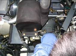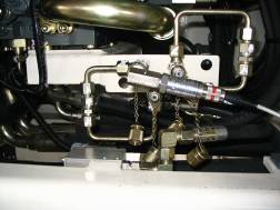 按下控制屏上“F3”鍵,和“兔子開關(guān)”按鈕,快速收回斗桿,讀出回油壓力,應為110 bar,如果不對,就調(diào)斗桿油缸上的節(jié)流閥,使之達到目的100 bar