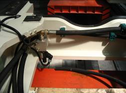 用工裝尺子量下邊履帶軌與下車架護輪架之間的距離,若距離大,將潤滑油槍放在沖注閥上注入潤滑劑直到履帶與護輪架之間的距離達到工裝尺子的長度。