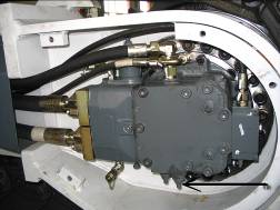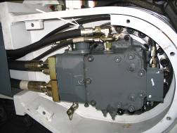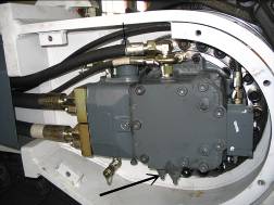 斷開回轉(zhuǎn)馬達制動油口,如下圖。在斷開的油管上接一測口,在斷開的馬達接頭處接堵頭。