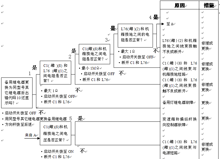 1)備用燈繼電器故障 2)變速箱和操縱桿控制器C1(雌)(8)L76(1)之間線束與電源短路,與機(jī)箱接地短路,觸點(diǎn)有故障或斷開(kāi) 3)后燈繼電器L76(雌)(2)和機(jī)箱接地之間線束觸點(diǎn)有故障或斷開(kāi) 4)變速箱和操縱桿控制器有故障 | ||||