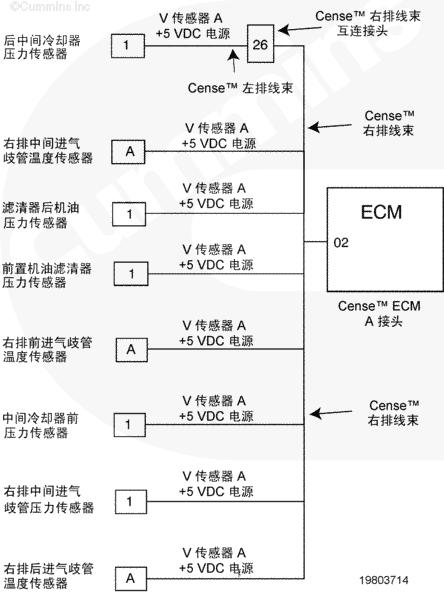 康明斯QSK78電子控制模塊 (ECM) 通過(guò) CENSE™ ECM A 接頭上的觸針 02 向 CENSE™ 線束上的傳感器提供 +5 VDC 供電。當(dāng)一個(gè)大于 5 VDC 的電壓源短接到該電路圖時(shí),所有連接到該傳感器的電源都會(huì)發(fā)生多個(gè)故障。發(fā)生這種情況是因?yàn)樗羞B接到該電源的部件信號(hào)電路圖電壓將上升到高于該部件的超出正常范圍(高壓短路)閾值。