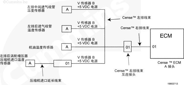 康明斯QSK78電子控制模塊 (ECM) 通過(guò) CENSE™ ECM A 接頭上的觸針 01 向 CENSE™ 線束上的傳感器提供 +5 VDC 供電。當(dāng)一個(gè)大于 5 VDC 的電壓源短接到該電路圖時(shí),所有連接到該傳感器的電源都會(huì)發(fā)生多個(gè)故障。發(fā)生這種情況是因?yàn)樗羞B接到該電源的部件信號(hào)電路圖電壓將上升到高于該部件的超出正常范圍(高壓短路)閾值。