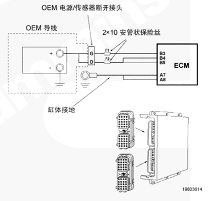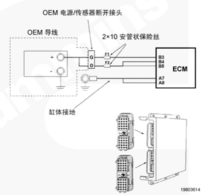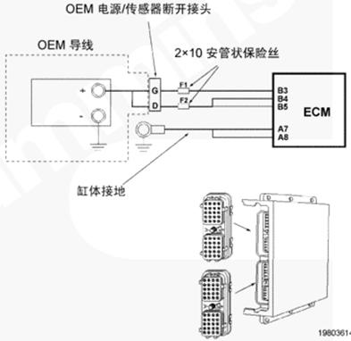 CM500 ECM 通過(guò) OEM 線束和康明斯QSK78發(fā)動(dòng)機(jī)線束接收無(wú)開(kāi)關(guān)蓄電池電壓。OEM 接口線束的無(wú)開(kāi)關(guān)蓄電池導(dǎo)線中有兩個(gè)個(gè)串聯(lián)式 10 安培保險(xiǎn)絲,以保護(hù) CM500 ECM??得魉筈SK78發(fā)動(dòng)機(jī)線束中的蓄電池回路導(dǎo)線連至康明斯QSK78發(fā)動(dòng)機(jī)缸體接地。
