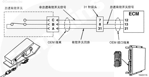 怠速有效信號(hào)在 CM500 ECM 檢測(cè)到不正確的有效信號(hào)時(shí)禁用油門(mén)控制,這是一個(gè)安全特性。怠速有效開(kāi)關(guān)通過(guò) OEM 線束和 OEM 接口線束向 CM500 ECM 提供怠速和非怠速有效信號(hào)。