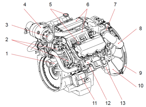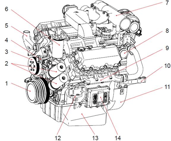 1 曲軸皮帶輪 2 機(jī)油濾清器 3 冷卻水泵皮帶輪 4 惰輪 5 冷卻水出口 6 燃油濾清器 7 空氣管 8 呼吸器 9 排氣歧管 10 安裝支架(后) (渦輪增壓器到中冷器) 11 飛輪殼 12 安裝支架(前) 13 油底殼 14 電氣控制裝置(ECU) 15 動力轉(zhuǎn)向泵 16 空氣壓縮機(jī) 17 渦輪增壓器 18 空氣管 19 空氣加熱器(空氣濾清器到渦輪增壓器) 20 空氣管 21 氣缸蓋罩 22 加油口蓋 23 冷卻水入口 24 起動機(jī) 25 機(jī)油冷卻器