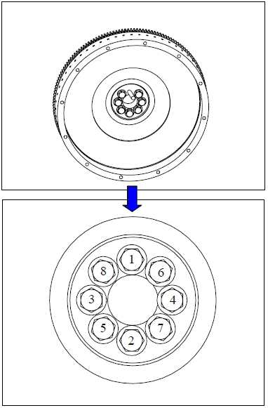 � 將導(dǎo)向銷(xiāo)插入飛輪孔中并暫時(shí)擰緊固定螺栓2∼3 個(gè)螺紋后,按擰緊順序(鋸齒形順序)將其擰緊至規(guī)定扭矩。