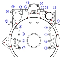 � 在將飛輪殼孔與導(dǎo)向銷(xiāo)配合,并將固定螺栓擰緊2∼3 個(gè)螺紋后,按照擰緊順序(鋸齒方式)擰緊固定螺栓至規(guī)定扭矩。