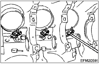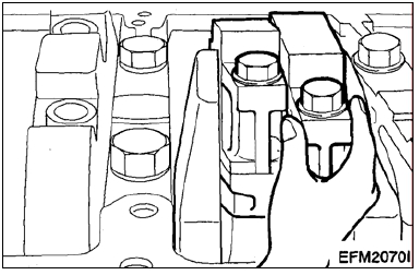 � 按氣缸號(hào)碼的順序排列活塞總成并在連桿和軸承蓋上安裝軸承。但是,小心不要互換連桿和軸承蓋的軸承。