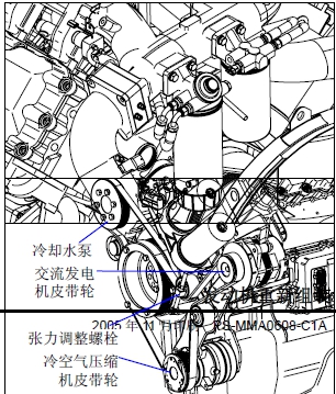 � 進(jìn)行連接時(shí),將皮帶安裝到曲軸皮帶輪、交流發(fā)電機(jī)皮帶輪、冷卻水泵和冷空氣壓縮機(jī)皮帶輪上。