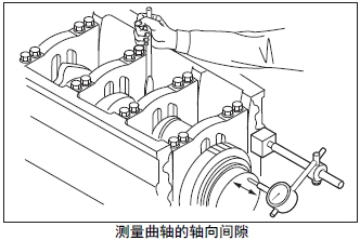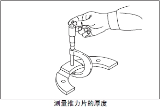 測(cè)量推力片的厚度。超過極限值時(shí)更換新的推力片。根據(jù)曲軸的磨損程度,在曲軸重新研磨使用時(shí),使用加大尺寸的推力片。曲軸的研磨要領(lǐng)參考「發(fā)動(dòng)機(jī)本體的檢測(cè)、修理」的「最后端曲軸頸的軸頸寬度研磨」項(xiàng)。