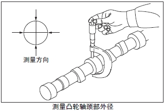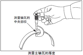 測(cè)量主軸瓦的中央部位的厚度。超過極限值時(shí),將主軸瓦上下整套更換。根據(jù)曲軸頸的磨損程度,在曲軸重新研磨使用時(shí),使用減小尺寸的主軸瓦。曲軸的研磨要領(lǐng)參考「發(fā)動(dòng)機(jī)本體的檢測(cè)、修理」的「曲軸的曲柄銷和曲軸頸的研磨」項(xiàng)。