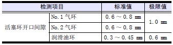 將活塞環(huán)放用標(biāo)準(zhǔn)量器或放在新的缸套內(nèi),測(cè)量開口間隙。超過極限值時(shí),更換整套活塞環(huán)。